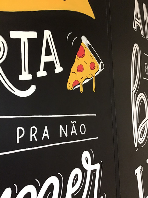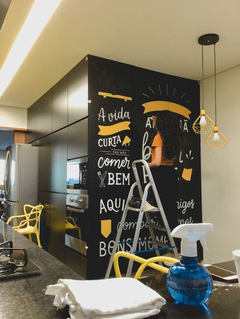Pintura personalizada em painel para a área da cozinha. Os clientes solicitaram a arte com tons de amarelo, com bastante contraste e referência a comidas e bebidas, ornando com o ambiente da cozinha.